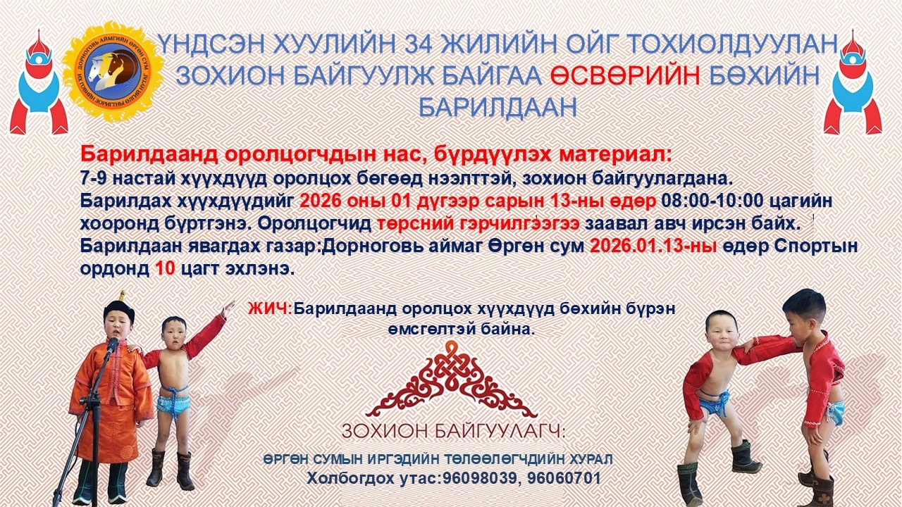 🖋️Жил бүрийн 01 дүгээр сарын 13-ны өдрийг ҮНДСЭН ХУУЛИЙН ӨДӨР болгон нийтээр тэмдэглэдэг бөгөөд энэ жил шинэ Үндсэн хууль батлагдсаны 34 жилийн ой тохиож байна. 🖋️Монгол Улсад шинэ Үндсэн хууль батлагдсаны 34 жилийн ойг тохиолдуулан Өргөн сумын Иргэдийн Төлөөлөгчдийн Хурал, Соёл, спортын төвтэй хамтран өсвөрийн бөхийн барилдааныг уламжлал болгон зохион байгуулж байна та бүхэн идэвхтэй хамрагдана уу? ӨРГӨН СУМЫН ИРГЭДИЙН ТӨЛӨӨЛӨГЧИЙН ХУРАЛ